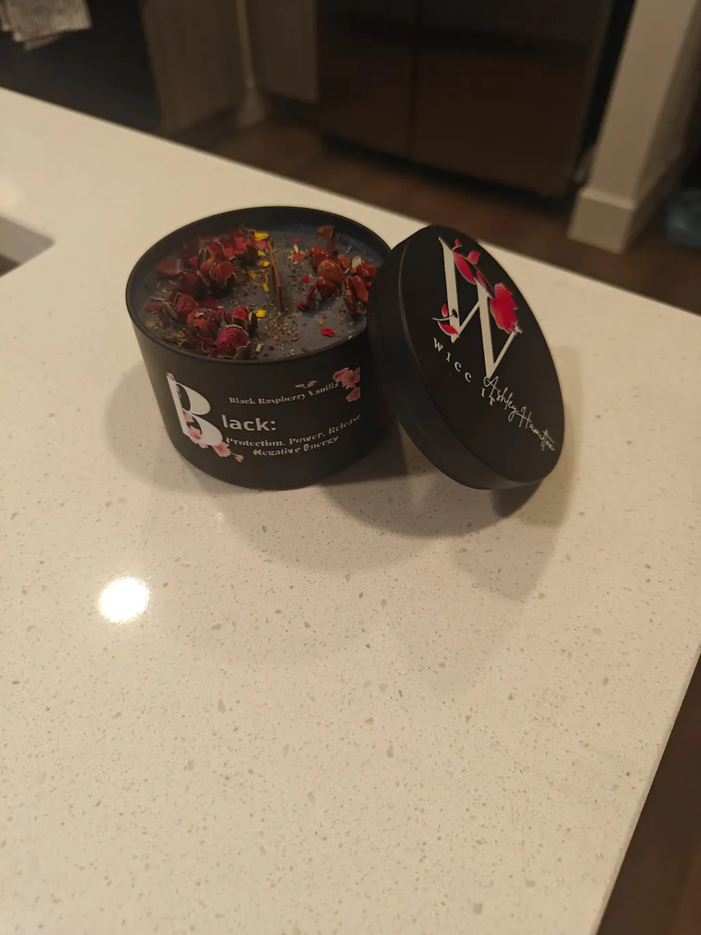This black wax is so pretty and the scent is so sweet. The little flower buds in the candle are so beautiful.